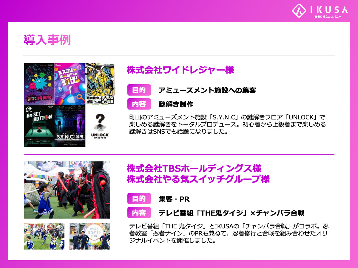 謎解きコンシェルジュ資料ダウンロード お困りごとはいつでも ご相談ください二ャ 謎解きコンシェルジュキャラクター「シェルジュ」 迷ったらこちら!全サービスをまとめた総合資料 謎解きコンシェルジュ総合資料 資料ダウンロード 資料を探す 目的から探す サービスの種類から探す 社内イベント 学校イベント 商業施設イベント 社内研修 地域活性化 プロモーション 謎解き脱出ゲーム 周遊イベント・宝探し 推理ゲーム 研修 防災・SDGs オンライン・ハイブリッド 社内イベントの資料一覧 全サービスをまとめた資料 謎解きコンシェルジュ 総合資料 資料ダウンロード 企業謎解きイベントの決定版 謎解き脱出ゲーム ご紹介資料 資料ダウンロード 参加者全員でのコミュニケーション活性化に! 謎パ ご紹介資料 資料ダウンロード 企業ならではのオリジナル謎解きを実施可能 周遊型謎解きゲーム (企業様向け)ご紹介資料 資料ダウンロード 25の試練にチームで挑め! 25HUNT ご紹介資料 資料ダウンロード クリティカルシンキングを学べる推理ゲーム 混乱する捜査会議からの脱出 ご紹介資料 資料ダウンロード あの「カイジ」 の世界観を社内イベントでっ……! カイジ×チームビルディング 運命共同録カイジ ご紹介資料 資料ダウンロード 目の前で事件が起きる!?超没入型推理ゲーム イマーシブミステリーゲーム ご紹介資料 資料ダウンロード LINEを使って手軽に楽しめる謎解きゲーム LINE謎解き ご紹介資料 資料ダウンロード リアルなメカを使った没入体験を メカナゾ ご紹介資料 資料ダウンロード チームでポイントを稼ぐミッションラリー ヒラメキクエスト ご紹介資料 資料ダウンロード 短時間のイベントやオンラインイベントに活用可能 おみやげ謎 ご紹介資料 資料ダウンロード 拠点間を超えた交流を楽しめる ハイブリッドイベント ご紹介資料 資料ダウンロード ジグソーメソッドを活用した推理ゲーム リアル探偵チームビルディング ご紹介資料 資料ダウンロード 防災を楽しく学べるチームビルディング型謎解き 防災謎解き脱出ゲーム ご紹介資料 資料ダウンロード 水害に対処するシミュレーションを通じて防災知識を学ぶ 災害リアリティゲーム「水害サバイバル」 ご紹介資料 資料ダウンロード オンラインチームビルディングの決定版 リモ謎 ご紹介資料 資料ダウンロード グループを超えた交流を促進する推理ゲーム リモ探 ご紹介資料 資料ダウンロード 防災×チームビルディング×オンライン 防災謎解きONLINE ご紹介資料 資料ダウンロード リアル会場のようなパーティー感を楽しめる リモBako ご紹介資料 資料ダウンロード SDGsをオンライン謎解きで楽しく学ぶ ある惑星からのSOS ご紹介資料 資料ダウンロード 会社パーティーの幹事様必見! 会社のパーティー・宴会 進行台本集 資料ダウンロード 社員旅行の幹事様必見! 社員旅行のマンネリ化を防ぐアクティビティ5選 資料ダウンロード 学校イベントの資料一覧 全サービスをまとめた資料 謎解きコンシェルジュ 総合資料 資料ダウンロード 企業謎解きイベントの決定版 謎解き脱出ゲーム ご紹介資料 資料ダウンロード 参加者全員でのコミュニケーション活性化に! 謎パ ご紹介資料 資料ダウンロード LINEを使って手軽に楽しめる謎解きゲーム LINE謎解き ご紹介資料 資料ダウンロード リアルなメカを使った没入体験を メカナゾ ご紹介資料 資料ダウンロード チームでポイントを稼ぐミッションラリー ヒラメキクエスト ご紹介資料 資料ダウンロード 短時間のイベントやオンラインイベントに活用可能 おみやげ謎 ご紹介資料 資料ダウンロード 拠点間を超えた交流を楽しめる ハイブリッドイベント ご紹介資料 資料ダウンロード 水害に対処するシミュレーションを通じて防災知識を学ぶ 災害リアリティゲーム「水害サバイバル」 ご紹介資料 資料ダウンロード オンラインチームビルディングの決定版 リモ謎 ご紹介資料 資料ダウンロード 防災×チームビルディング×オンライン 防災謎解きONLINE ご紹介資料 資料ダウンロード リアル会場のようなパーティー感を楽しめる リモBako ご紹介資料 資料ダウンロード SDGsをオンライン謎解きで楽しく学ぶ ある惑星からのSOS ご紹介資料 資料ダウンロード 会社パーティーの幹事様必見! 会社のパーティー・宴会 進行台本集 資料ダウンロード 社員旅行の幹事様必見! 社員旅行のマンネリ化を防ぐアクティビティ5選 資料ダウンロード 商業施設イベントの資料一覧 全サービスをまとめた資料 謎解きコンシェルジュ 総合資料 資料ダウンロード 体験型企画を活用したプロモーション あそぶプロモーションご紹介資料 資料ダウンロード 施設の魅力を効果的にPRできる 周遊型謎解きゲーム (商業施設様向け)ご紹介資料 資料ダウンロード 地域の歴史を楽しく学べる周遊型謎解き 戦国宝探し ご紹介資料 資料ダウンロード 大人気の「宝探し」をリーズナブルに実施可能! 宝探しラリー ご紹介資料 資料ダウンロード SDGsを楽しく学べる周遊型謎解きパッケ