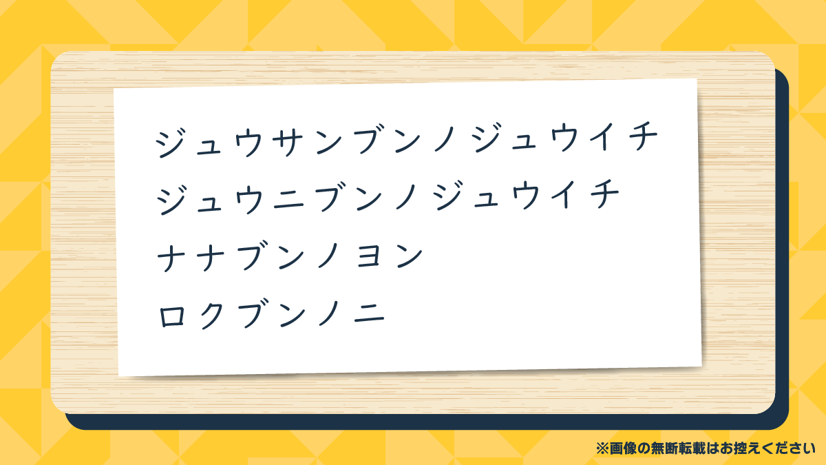 onigiri LEVEL2 ウソつきな謎 2024年1月19日 送信 ウソつきな謎 正解です!おめでとうございます! 解説を見る X(Twitter)でシェア 答えが違うようです。 もう一度チャレンジしてみましょう! ヒント法則に基づいて「正解」は何になるかを導きましょう。「法則は嘘です」の文も、法則性を表す文の1つのようです。 解説を見る もっとじっくり 謎解きを楽しみたい方はこちら 謎解きの制作や 問題使用の依頼はこちら LEVEL1 まずはここから!初心者おすすめの謎 LEVEL1 謎のグリッド LEVEL1 10個のマス LEVEL1 めぐるぐる もっと見る LEVEL2 チャレンジ!慣れてきた人向けの謎 LEVEL2 ブンスウノメモ LEVEL2 食べ物の化学式 LEVEL2 紙亀算 もっと見る LEVEL3 謎解き好きへ!歯ごたえのある謎 LEVEL3 きもだめし LEVEL3 わくわくわく LEVEL3 ループでつなぐ もっと見る LEVEL4 解けたらすごいぞ!ちょいムズ謎 LEVEL4 スクエアカット LEVEL4 カラフルスクエア LEVEL4 謎のベン図 もっと見る LEVEL5 三度の飯より謎が好き!激ムズ謎 LEVEL5 君ならどうする LEVEL5 数字のパズル LEVEL5 どれがどこ? もっと見る LEVEL1 謎のグリッド LEVEL4 スクエアカット LEVEL2 ブンスウノメモ